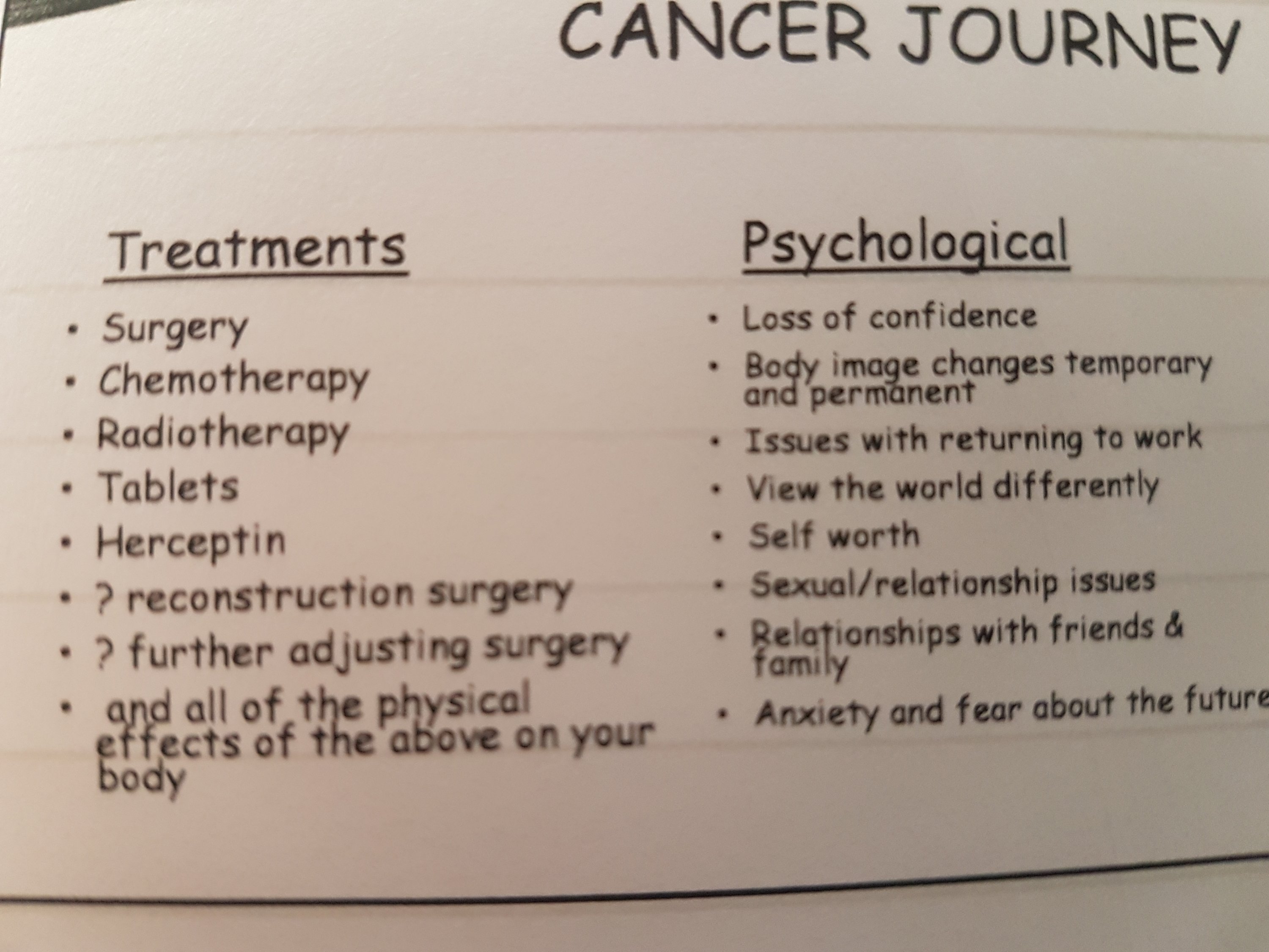 The physical sign of cancer treatment I can cope with, it’s just niggles and that’s fine cos I am here over a year later, back at work and starting to live life again. It’s the psychological side that’s so very very hard, the mixture of I should be jumping around and running marathons (me run any where is too laughable) I am in-remission, I am wellish and the guilt that some days I am not happy, I am consumed by worry and insecurities that I never felt before. Every ache or pain, new or old is scrutinised the what ifs, is it back. Is that a sign of secondary cancer? And around it goes, I have even had thoughts my tamoxifen isn’t working, I have no side effects my periods have returned, does this mean tamoxifen isn’t doing what it should – keeping cancer at bay. I know on a good day all these thoughts are normal but also not actually right, on a good day I know I am just lucky that tamoxifen hasn’t given me any side effects, and my aches are normal everyday aches after the year my bodies been through. Some times I need to hear that from ladies who have also been there – I never thought that I would need that kind of support, but having met these inspiring ladies and leaning on them, I understand the power of shared experiences – we need to remember we are never alone, there is always someone out there that understands and wants to help π
